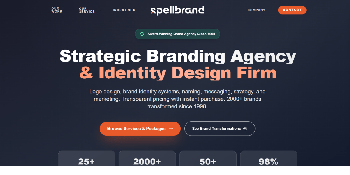 Spellbrand has been an affordable branding agency since 1998, with over 2,000 businesses served and partners across four continents. Their five-phase approach covers brand substance, positioning strategy, archetypes, messaging, and visual language. At $350 for entry-level packages, Spellbrand is the most accessible option on this list for small businesses that need more than a logo but cannot commit to a multi-thousand-dollar engagement.