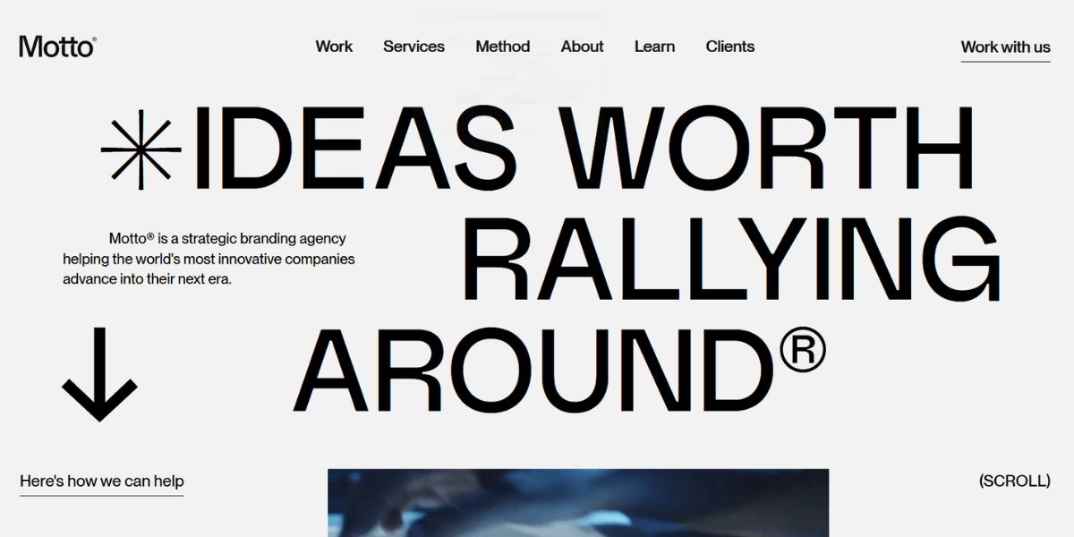 Motto is a global branding agency with 18 years of experience and over 1,200 brands transformed. Their Flagship process covers brand strategy, messaging, naming, identity, and activation. Motto's client list includes Google, Virgin, and Hershey's alongside smaller challengers. So, they are not exclusively a small business agency. But their process works particularly well for founders who have a strong vision and need a partner to translate it into a brand that communicates on its own.