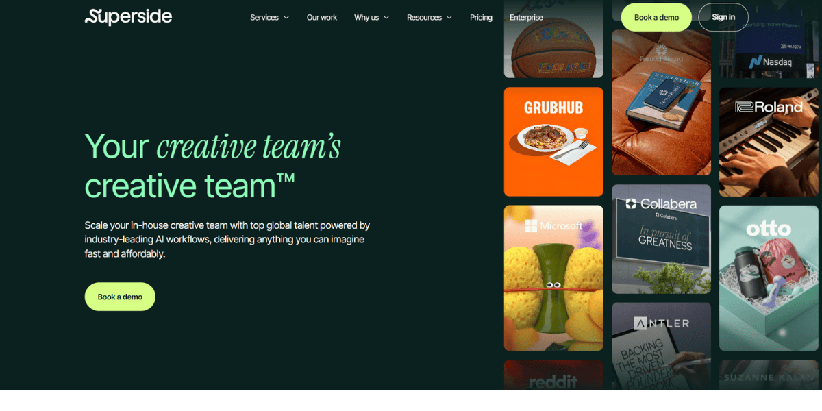 Superside is an AI-powered creative service designed for enterprise-scale demand. They offer a comprehensive range of design services — from brand design and UI/UX to motion graphics and web development — through a subscription model tailored to larger organizations.