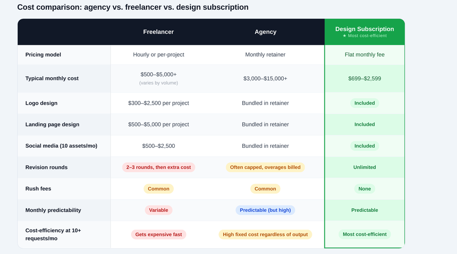 Freelancers are cheaper per project for one-off work, typically billing $25 to $150 per hour. Agencies charge retainers starting around $3,000 to $5,000 per month. For ongoing needs above 8 to 10 requests per month, a design subscription is typically cheaper than both when measured by cost per delivered asset.