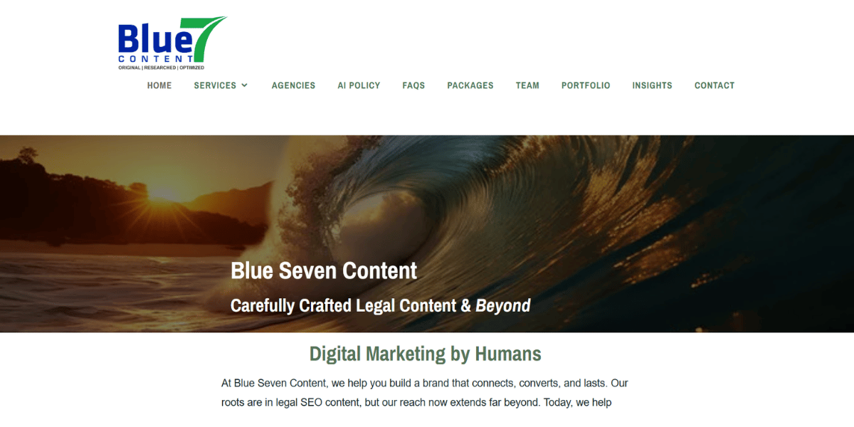 Blue Seven Content is a content marketing agency that specializes in law firms and includes graphic design as part of their content strategy offering. Their design work covers website graphics, social media visuals, and infographics, all tied to a broader content and SEO strategy. Their pitch is that visuals and written content should work together, and they handle both.