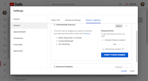 Go to your Profile Tab, tap Settings, and the Channel status and features. Here you can see a bunch of features that have or haven’t been unlocked. Tap the blue button that says Verify and select the preferred method of verifying your channel (via text message or automated call).