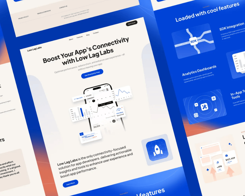 Here’s one example of an eye-catching landing page created for Low Lag Labs, a technology company that provides connectivity-focused tools and analytics to help mobile app developers understand and improve how network performance impacts user experience.