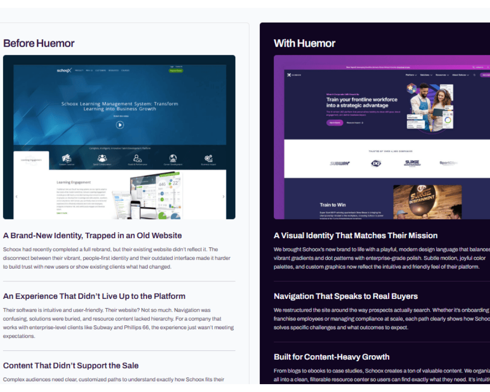 Huemor partnered with Schoox, a cloud-based enterprise learning management system (LMS) and workplace learning platform designed to help organizations train, develop, and upskill their workforce. Huemor rebuilt the site with a modern UI/UX, clearer navigation paths tailored to real buyer needs, and a scalable content structure for blogs, ebooks, and resources — all on a WordPress platform optimized for growth